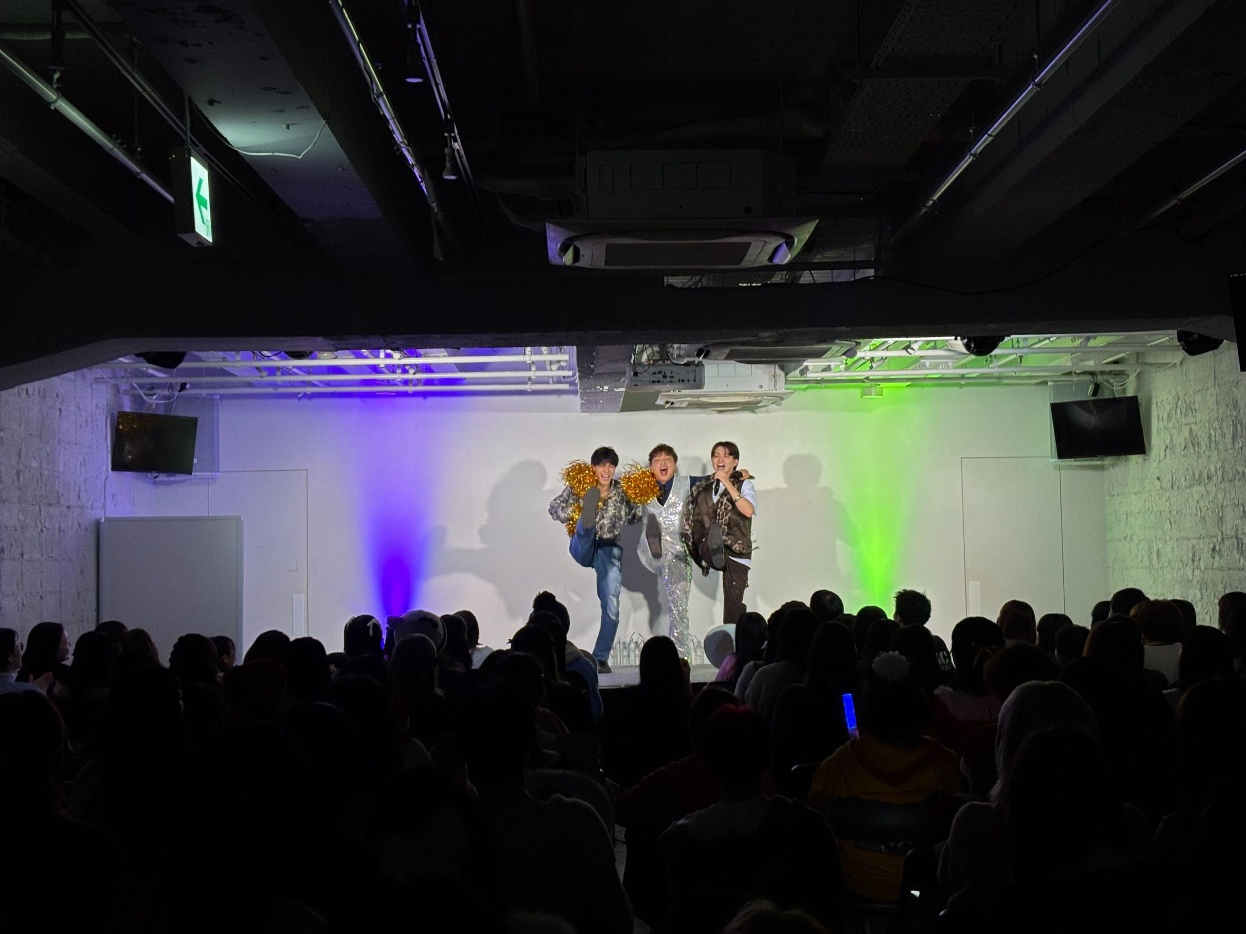 終盤の金のポンポンを使ったダンスは3人の息がバッチリで、笑いを誘い、練習の成果を発揮。
