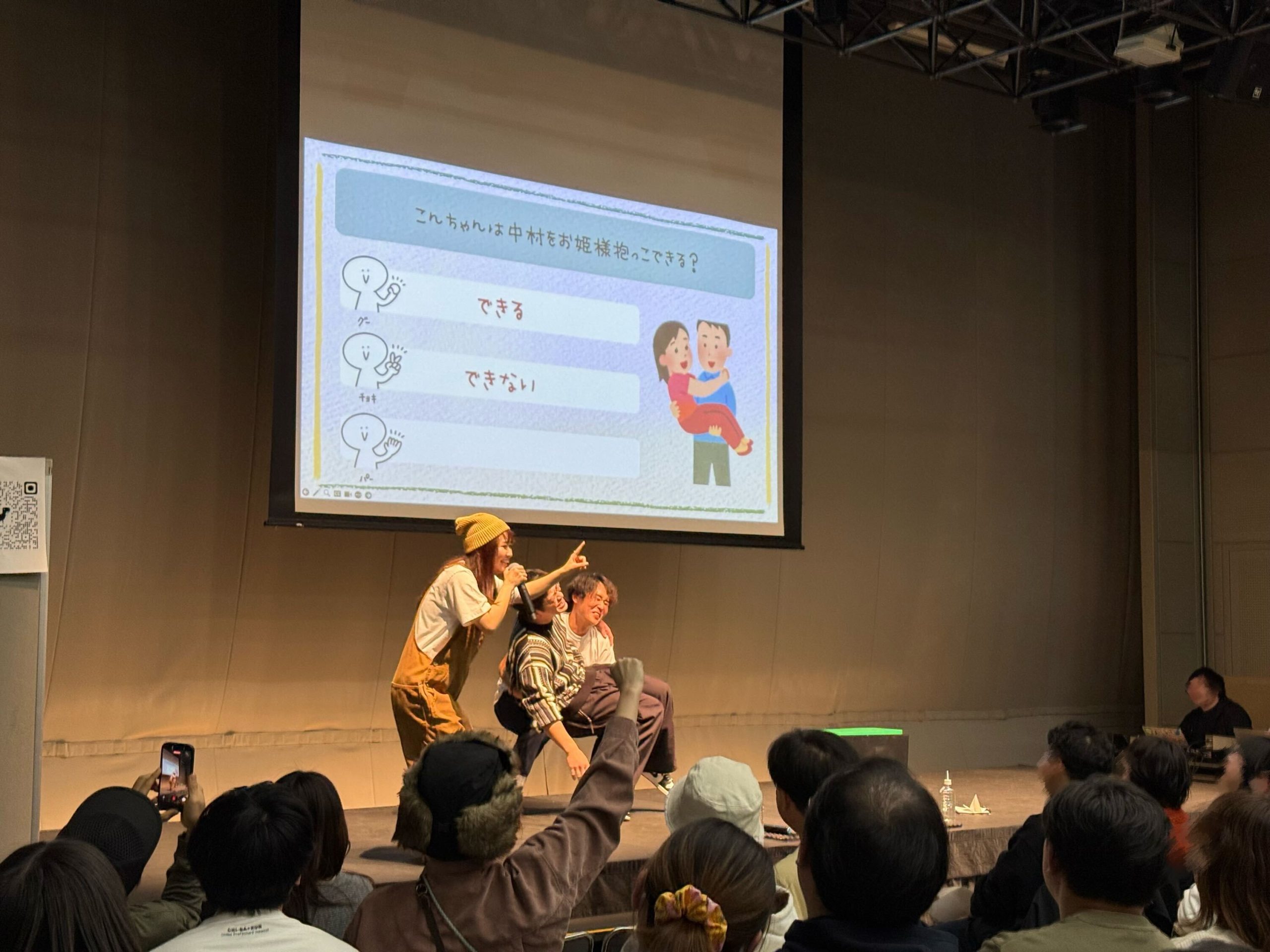 「こんちゃんは中村さんをお姫様抱っこできる?」では、答えが「できる」「できない」の2択になり、実際に10秒以内に中村さんをお姫様抱っこできるかステージで試みることに。結果、こんちゃんは2秒で体勢を崩してしまい、「できない」が正解となりました。