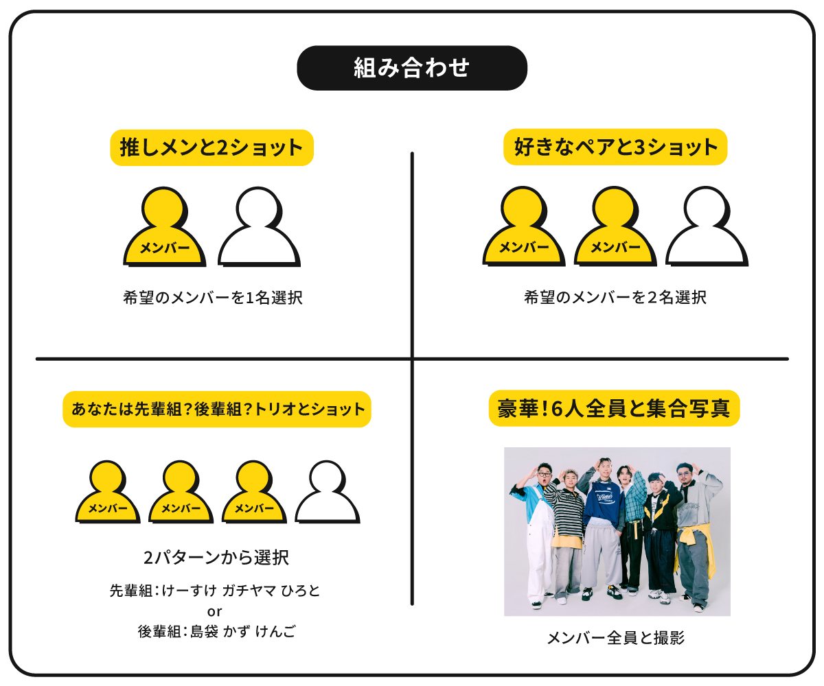 追加公演では個別 or 全員集合に加え、2人組/3人組など好きなメンバーの組み合わせでお写真を撮影可能となります。