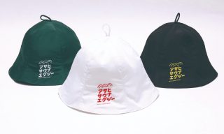商品概要:ナイロン素材を使用したサウナハット。フロント・バックサイドにはコラボロゴ刺繍を施した仕様になっています。